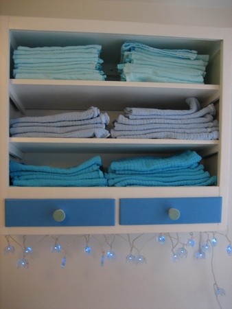 At vi så stadigt ikke efter et halvt år kan vaske stofbleerne med hvide ting, uden at de får en fin mintgrøn farve (se venligst håndklæderne øverst på reolen for billeddokumentation) er en konsevens, jeg gerne tager med og undlader at snakke alt for højt om i mødregruppen, når de kaster misundelige blikke efter dem.
