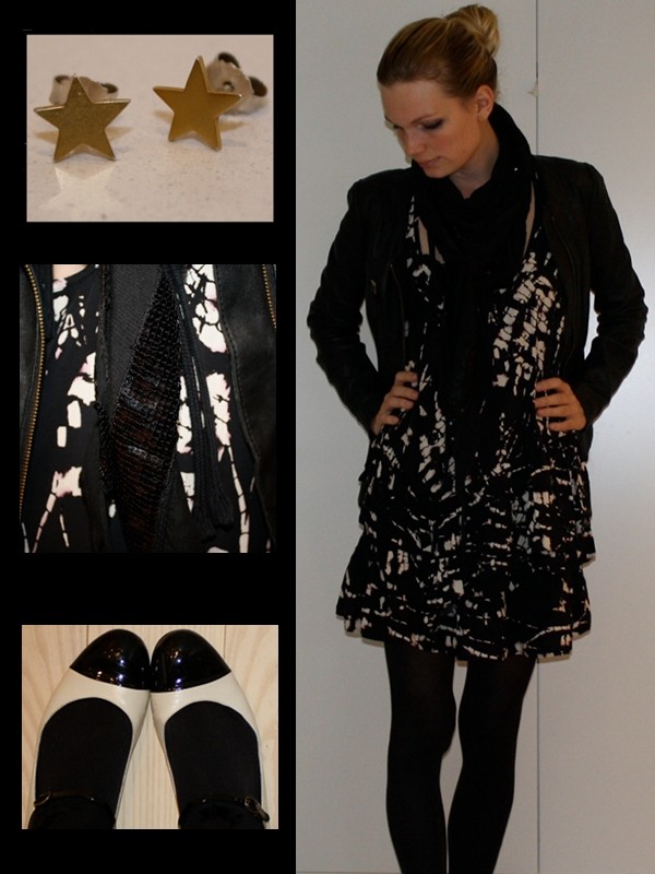 Jeg havde fundet min nye kjole fra Topshop frem og understregede den lidt rå stil vha. læderjakke og mit tørklæde med pailletdetaljer – til gengæld havde jeg så taget et par sko fra Marc by Marc Jacobs på, som var lidt finere i udtrykket og kunne bløde det hårde look lidt op.