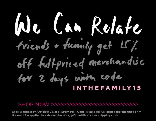 Shopbop har lige nu en eksklusiv rabat, som er meldt ud via deres nyhedsbrev. Den giver 15% rabat på alle ikke nedsatte varer, men gælder kun til i morgen onsdag kl 21 pm PDT (hvad er det mon lige i dansk tid?).