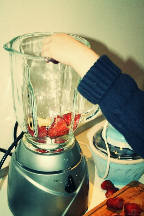 Jeg putter forsigtigt alle ingredienserne i blenderen – her har vi brugt ananas, jordbær, banan og yoghurt natural.
