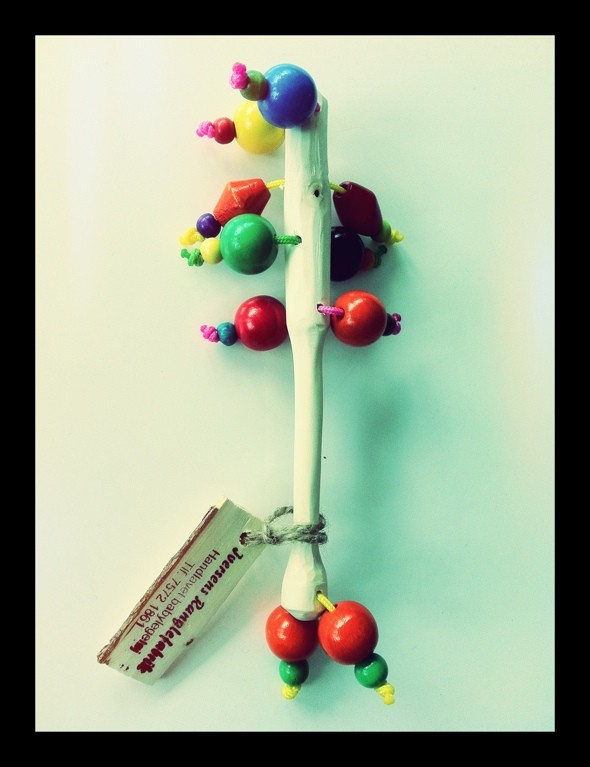 Ifølge mit umiddelbare indtryk, så er den fantastisk lækkert forarbejdet – håndtaget ser håndsnittet ud, træet er skønt og blødt at røre ved, perlerne er dejligt farvestrålende – ja lækkerhedsfaktoren er i hvert fald i top.