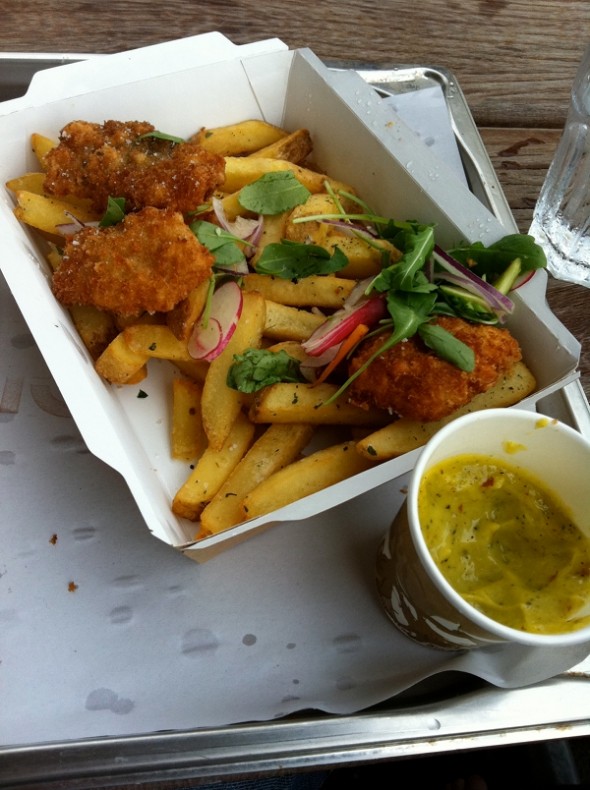 Vi fik os bænket udenfor, hvor vi nød det vidunderlige vejr, mens vi smagte deres fantastiske fish’n’chips – det kan virkelig anbefales – selv Trutten, der lige pt er inde i en meget selektiv fase i forhold til, hvad han putter i munden (mine forældre ville nok vælge at kalde en spade for en spade og sige, at han er kræsen 😀 ) elskede det.