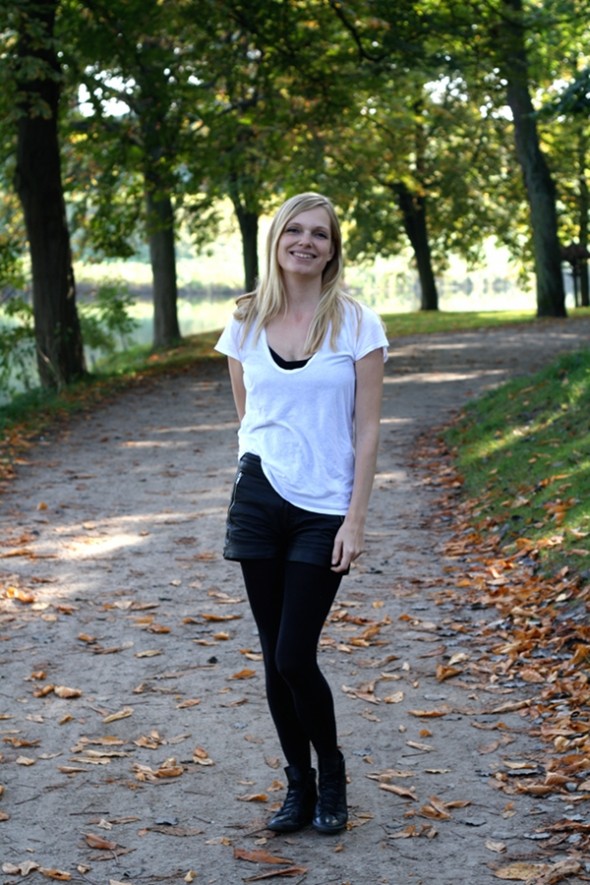 Lædershorts: Cheap Monday -.- T-shirt: T by Alexander Wang -.- Strik: Topshop -.- Sko: Converse