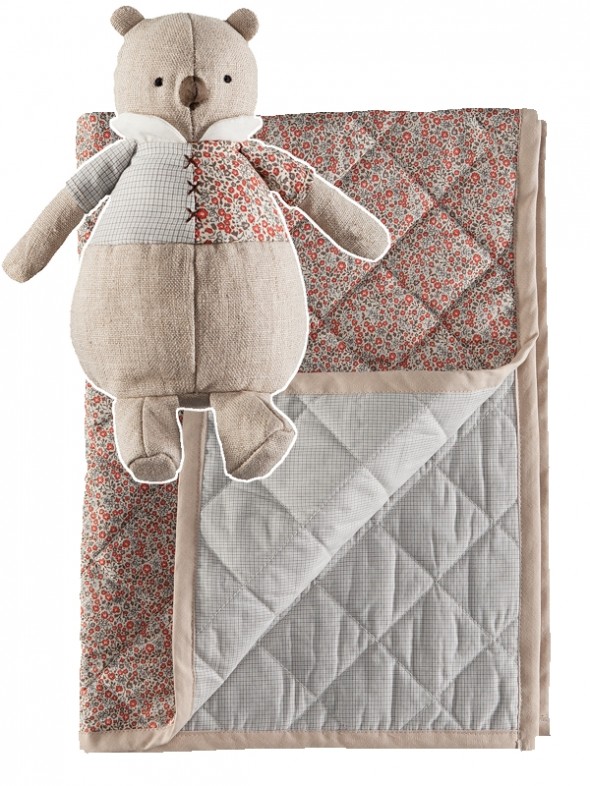Den er lavet i et smukt tidløst design i en fin fransk stil (som jeg jo elsker) – og der er komplette sæt til både drenge og piger med bodystocking, cardigans, strikkede bukser, varme futter, lune huer – og oven i købet findes der også det smukkeste tæppe en rangle og en skøn, skøn bamse.