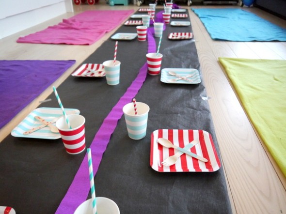 Jeg besluttede derfor, at børnene skulle sidde på gulvet – jeg ryddede stuen for møbler og foldede en sort papirdug, så den blev lidt smallere (det kostede vanvittigt meget at købe en decideret løber i papir – så dette var en oplagt løsning) klistrede den fast med tape, så den blev siddende til trods for en masse små børnehænder og fødder overalt.