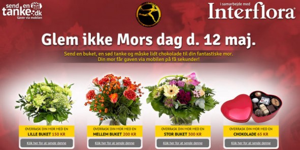 Sendentanke.dk har lavet en speciel side med gaver til Mors Dag, hvor du kan sende en gave på mobilen til din mor – det er især også oplagt, hvis du er lidt sent ude med gaven til hende 😉 Du kan vælge mellem flere størrelser buketter fra Interflora eller en lækker æske chokolade – og gaven kan være fremme i løbet af et splitsekund sammen med en personlig hilsen, hvorefter din mor selv kan indløse den i en butik.